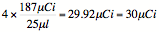 After the reference date, the total activity of the fresh hot CTP was 250 μCi in 25 μl, and the concentration was 10 μCi/μl (10 mCi/ml). But now, it is 187 μCi because 0.748×250=187. If 4 μl is used for in-vitro transcription reaction, the total amount used would be 4×187 μCi/25μl= 29.92=30 μCi for each reaction.