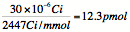 After the reference date, the total activity of the fresh hot CTP was 250 μCi in 25 μl, so 10 μCi/μl (10 mCi/ml). But now, it is 187 μCi because 0.748×250=187. For example if 4 μl was used for in-vitro transcription, the total amount used would be