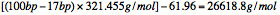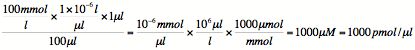 (where 321.455g/mol is the average mass of rNTPs, 100 nt is the number of bases, 17 nt is the number of bases in the T7 promoter which are not transcribed, 61.96 is a constant for net difference due to missing 5’ phosphates and additional 5’ and 3’ hydrogen). If all the CTP were incorporated, the theoretical mass of RNA would have been 1012.3 pmol×26618.8 pg/pmol= 26.9 μg.