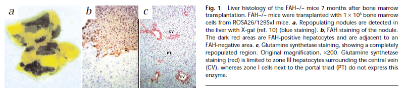 Tyrosinemia type 1 results from a lack of enzymes necessary to metabolize tyrosine, leading to liver and kidney failure. Mice that would normally die from tyrosinemia without intervention had restored liver function following injection of hematopoietic stem cells from bone marrow. A biopsy found that large sections of the liver had been taken over by differentiated hematocytes that could properly metabolize tyrosine. Studies in humans have shown improved liver function in hepatitis C patients [5].