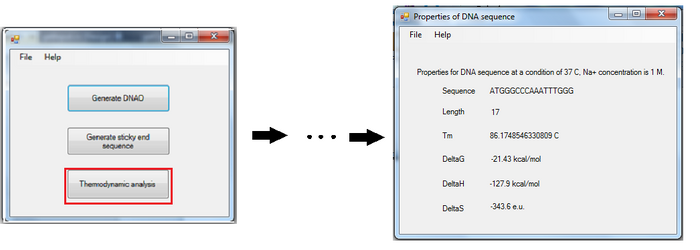 The other component of the software is also to support the sticky end analysis in which thermal dynamic values of the sequence are calculated. Users need to enter the sequence they want to analyze, together with the condition in which they would test the DNA (total DNA strand concentration, Na+ concentration, and melting temperatures). Thermaldynamics value including deltaG, deltaS, deltaH, and Tm are provided in the results pages.