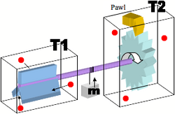 Such a machine is one that is theoretically capable of producing work from random variations that are a result of a heat bath that has no net flow of energy or mass. An image of the machine is shown below. The size of this machine is so small that the energy of a single molecule hitting the paddle wheel (the blue object in the T1 chamber) will be sufficient to rotate the system at least one notch on the ratchet and raising the the block that is tied to the axle in the process. The paddle wheel cannot spin backwards due to the pawl (the yellow object) and so clearly this starts to look like a classic example of a Maxwell Demon where the entropy of the system is decreased as the axle spins in only one direction based solely on the disorderly energy of the heat bath of T1. [3][4]