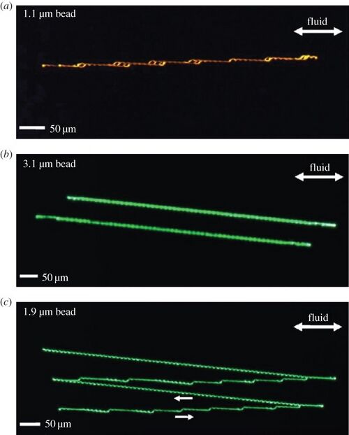 which has no time derivatives, and because of this, all of the flow paths becomes reversible. It is important to note however, that despite the flow being reversible, the non-hydrodynamic forces initiated by the collisions between the large materials and the obstructions causes the flow trajectories to be irreversible for some material sizes as is shown by the image below. [1][5][6]