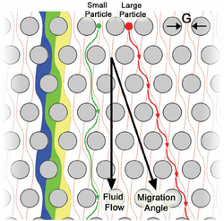 Often pillars/obstructions placed in a channel have little overall effect on the materials moving within that channel unless your intention is to mix them.  However, when we start using more obscure pillar shapes or altering the arrays of those obstructions so that they are tilted (rather than having rows and columns that are perfectly horizontal and vertical), we can start to observe some interesting results. The first of which is the sieve nature, where the smaller materials are essentially unobstructed and continue with the flow, but the larger objects start to drift down a different direction despite the flow regime being uniform over the whole array.  Most interestingly, this is exactly opposite of what you would expect to happen in regards to the entropy of the system, which would often prefer a thoroughly diffused mixture of materials. This is a result of the low Reynolds number creating a highly laminar flow that effectively prevents diffusing.  In addition, the low Reynolds number has allowed us to reduce the Navier stokes equation