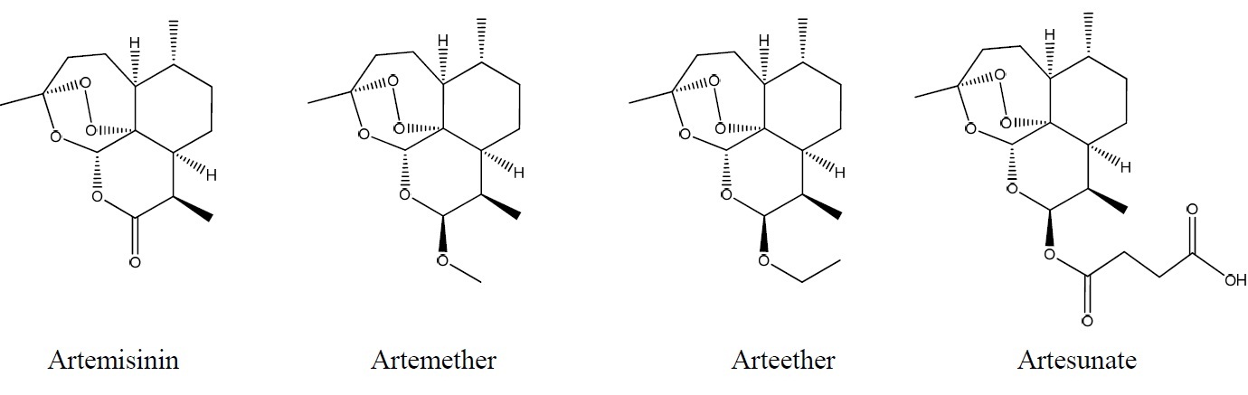 Artemisinin posses antimalarial capabilities due to its trioxane ring structure. It is capable of killing the malaria parasite while infecting human red blood cells, and even proved effective on strains resistant to commonly used antimalarial drugs. Unfortunately, the ketone group on the bottom of artemisinin, shown below, imparts negative characteristics. In its native form, artemisinin has low solubility in both water and oil. This makes the compound difficult to produce and distribute, and led to the development of its multiple derivatives shown below. Note the expansion of the ketone group on the bottom of artemisinin in successive derivatives, which contribute to their increased solubility and potency[3].