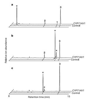 Finally, Ro et al. isolated the genes responsible for converting amorphadiene to artemisinic acid in Artemisia annua and introduced them into S. cerevisiae. First, a genomic analysis of plants in the Asteraceae family was performed to determine common ancestor enzymes. It was determined that cytochrome P450 monooxygenase from sunflower and lettuce were compatible, and P450 gene fragments were obtained from the Asteraceae EST-database. A cDNA library of P450 fragments was created using random primers specific to CYP71 Asteraceae subfamily, and BLAST analysis was employed to determine the conservation of P450 gene across the entire Asteraceae family. The BLAST analysis determined that the P450 gene was an acceptable candidate for introduction into S. cerevisiae. The isolated P450 cDNA encoding for CYP71AV1 was then incorporated into S. cerevisiae. For stability of this CYP71AV1 enzyme, cytochrome P450 oxidoreductase (CPR) was also isolated from Artemisia annua and introduced into S. cerevisiae. This allowed for an effective 3-step oxidation pathway to convert amorphadiene into artemisinic acid.