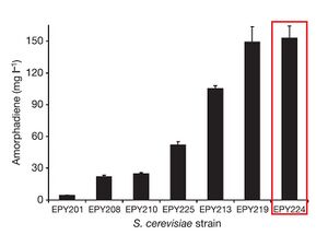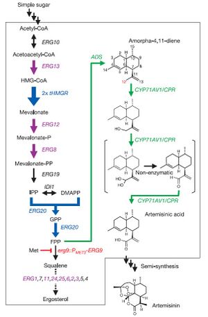 In a paper released by Ro et al., Saccharomyces cerevisiae was engineered to produce artemisinic acid from simple sugars. This involved metabolic engineering of the mevalonate pathway, naturally present in S. cerevisiae, to introduce a three-step pathway that converts amorpha-4,11-diene into artemisinic acid.