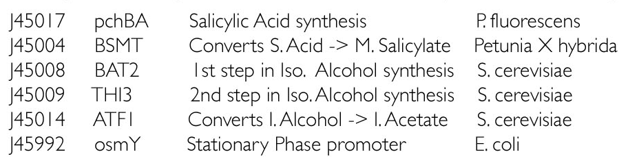 The 2006 MIT iGEM team created an E. coli strain that emitted a wintergreen scent (methyl salicylate) in log phase growth and then switched to producing a banana scent (isoamyl acetate) when nutrients became scarce. They used a chassis strain called YYC912 (tnaA5-) that is deficient in indole production (the characteristic foul-smelling compound of E. coli cultures). Genes were introduced that could synthesize the VOCs from media additives (salicylic acid) or natural amino acid production (leucine).