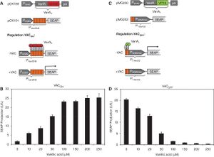 They then assembled a circuit where the default state for M. salicylate production during exponential growth is "on". The wintergreen pathway is under control of the osmY stationary phase promoter upstream of a TetR transcriptional inverter. The isoamyl acetate pathway is under control of the osmY promoter alone. When osmY transcription is activated at stationary phase, the wintergreen pathway is inverted to "off" and the banana pathway is activated.