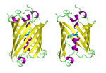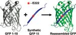 Split GFP's are GFP polypeptides that have been separated and can be re-formed in vivo. Together, the two form the complete GFP protein and fluoresce with an intensity that can be measured. The most commonly used form of split GFP consists of a "superfolder" GFP that is particularly stable when split into GFP 1-10 and GFP 11. GFP 1-10 the first 214 amino acids of GFP, including residues 65-67 that become the chromophore) and a synthetic GFP 11, which completes the β-barrel of the GFP protein. The separate pieces of GFP can be bound to proteins that interact; when interaction occurs, the GFP fragments spontaneously reassemble and fluoresce, allowing for in vivo measurement of protein interaction. Split GFP is particularly helpful because it has increased solubility relative to standard EGFP, and GFP 11 is so small that it can be bound to proteins without affecting their function greatly.[7]