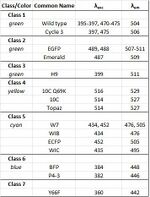 The excitation and emission wavelength spectra and the color of emission of each of these derivatives are different, as shown in the table. The first 4 classes are polypeptides with a Tyr and position 66, while the final 3 have Trp, His and Phe at that position respectively.[2]
