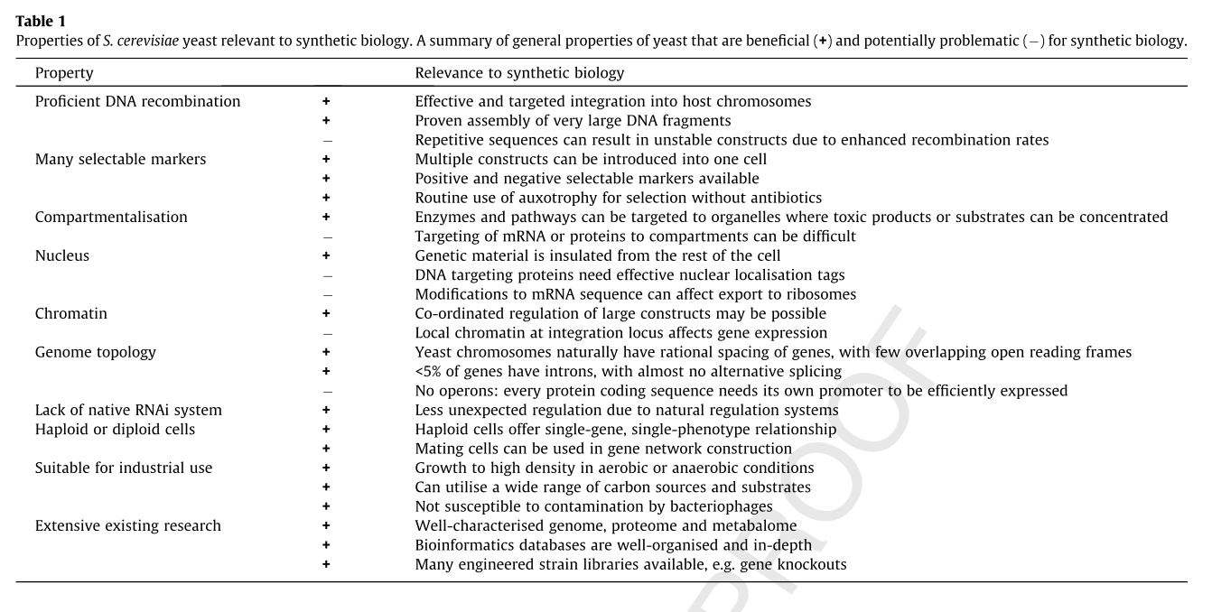 The following table summarizes some of the advantages and disadvantages of using yeast as a model organism for synthetic biology. [2]
