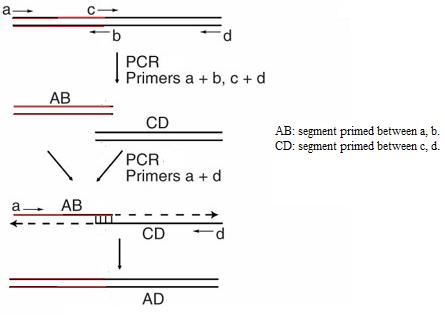 - Or so called Overlap extension PCR. This technique is to insert mutations at specific points or to join the spliced smaller DNA fragments into a larger one. As can be seen from the following graph, this PCR consists of two stages: