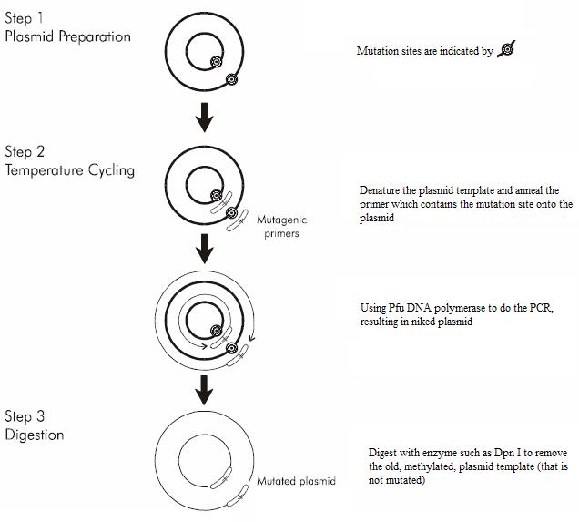 - Firstly, a pair of mutation site containing primers are used. This time, the template is the whole plasmid. PCR reaction uses a high-fidelity DNA polymerase such as pfu polymerase. The reaction generates a nicked, circular and relaxed DNA. The original normal template DNA must be eliminated by enzymatic digestion with enzyme such as DpnI which is specific for methylated DNA. All DNA produced from most Escherichia coli would be methylated; the template plasmid will therefore be digested, while the mutated plasmid is generated in vitro and is therefore unmethylated would be left undigested, and is submitted for next round with final filling up of the nicks in host cells.