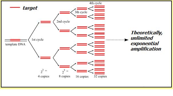 In this process, newly formed (synthesized, but with the loyalty to the parental target DNA sequence) strands can be used immediately in one-pot for the next round of reaction. Thus, through this repeating cycling, the final product is exponentially amplified.
