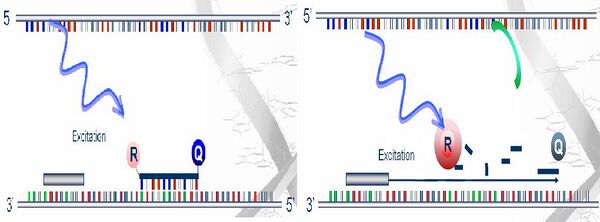 - Real-Time PCR is a way of quantifying the amplification of a DNA as it occurs-that is, in real time. As illustrated in the following graph: after separation of two DNA strands, they are annealed, not only to the forward and reverse primers, but also to a fluorescent-tagged oligonucleotide that is complementary to part of one of the DNA strands and serves as a reporter probe. This probe has a fluorescent tag at its 5' end and fluorescence quenching tag at its 3' end. During the polymerization step, the polymerase extends the forward primer and then encounters the reporter probe. When that happens, the polymerase begins degrading the reporter probe. As the probe is degraded, the fluorescent tag is separated from the quenching tag, so its fluorescence increases dramatically. A fluorimeter can measure the intensity along the PCR reaction course, which in turn, gives the real time progress.