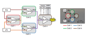 In Tamsir et al.[6] electronic digital inspired the creation of its biological counterpart.Each cell will perform simple genetic algorithms but when placed in a cell-to-cell format more complex functions can arise. E. coli has been engineered to harbor synthetic Boolean logic including AND, OR and NOT functions. What is unique about this circuit is the simple circuits are compartmentalized from the logic program as a whole and communicate through quorum sensing molecules. This allows for robustness by allowing colonies of cells to give a population averaged response. Also, the same genetic parts can be reused orthogonally. An OR gate was created simply by placing two promoters in tandem to each other, which respond to exogenous small molecules. The activation of either promoter will turn on the reporter gene that is directly downstream of the promoters.