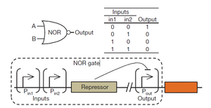 A simple NOR gate was created by placing two input promoters in tandem upstream of a repressor protein. The repressor will inhibit the reporter gene expression. Such that when either of the two inputs is in the ON state, the reporter gene is turned off.