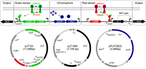 - Tabor JJ, Salis HM, Simpson ZB, Chevalier AA, Levskaya A, Marcotte EM, Voigt CA, and Ellington AD. A synthetic genetic edge detection program. Cell. 2009 Jun 26;137(7):1272-81. DOI:10.1016/j.cell.2009.04.048 |