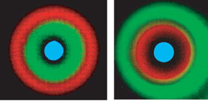 By varying the response of LuxR to AHL and the plasmid copy number, different responses to AHL concentrations are observed. This keeps the same banding pattern, but changes the response localization along the AHL gradient. This effect can be seen by using two cell types, with different responses and reporter gene. The result is a bullseye pattern, as the differing AHL response created different "sweet spots" between the two cell types. Interestingly, a dynamic "sweet spot" was observed when an unstable variant of LacI is used in place of the wild-type LacI. The response is due entirely the the spatial orientation of the sender cells. This was demonstrated by placing sender cells in various orientations and sizes. The placement of the senders on the plate created differing patterns. The fact that these programmed cells could create many complex patterns though a limited set of genetic circuitry is fascinating and gives insights on the origins and evolution of multicellular organisms.