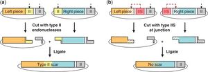 Type II restriction enzymes result in a scar when two fragments are ligated together. Type IIS endonucleases solve this problem by causing the sticky ends to be part of the gene itself, not the recognition sequence (see figure).