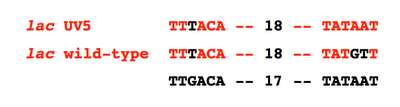 LacUV5 is a constitutive promoter mutated from of the lac promoter found in E. coli. The lac promoter is considered weak, it varies from the consensus sequence by 3 bases. On the other hand, the lacUV5 mutated promoter varies from the consensus sequence by only 1 base and is much stronger than the lac promoter. Even though lacUV5 is considered strong relative to other E. coli promoters, these are still weak when compared to T7 promoters.