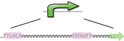 A DNA sequence that recruits transcriptional machinery and lead to transcription of downstream DNA. In E. coli the -10bp and -35bp are locations of the most well conserved DNA sequences in E. coli promoters. There are on average 17 bp between the two sequences and 7 bp between the -10bp location and the transcription start site. Consensus sequences are the nucleotide sequences that share a common function, which is binding to RNAP in the case of promoters. Promoters that most closely resemble the consensus sequence will be the strongest promoters, just as those that differ from the consensus sequence will be weaker promoters. Interestingly, there has not been a promoter found in E. coli that is of the consensus sequence, it would likely bind so strongly that elongation would not occur.