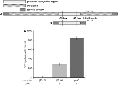 Sauer et al. generate various promoters spanning two orders in magnitude of strength. The promoters were based on the E. coli rrnB P1, a strong σ70-dependent promoter with near consensus −10 (TATAAT) and −35 (TTtACg) elements. The region from position -105 to +55 were insulated by nucleotide sequences that did not bind proteins, blocking all transcription factor binding sites, enhancer sites, as well as defining a specific 5' mRNA start site. Using proD, their first generation insulated promoter, the production of the GFP reporter gene was driven. Measuring strength of this promoter relative to another, the GFP synthesis rate was monitored. They found that the insulated proD promoter performed significantly better than a minimal promoter. Through the use of degenerate oligonucleotides, they randomized the -35 and -10 bp sequences to make a promoter library. [7] The result is a library of promoters that are highly predictable and minimize effects of from the surrounding genome.