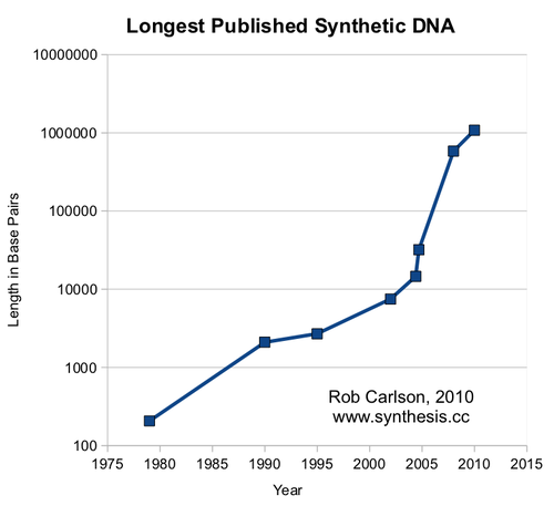 Gene synthesis is one of the key enabling technologies of synthetic biology. The increase in efficiency and the decrease in cost is occurring at a staggering rate. Below is a graph comparing DNA synthesis to Moore's Law. In addition, it includes another enabling technology, DNA sequencing. The bottom right graph shows that genome synthesis is technically feasible [4]; however, it is not yet a commercial service.