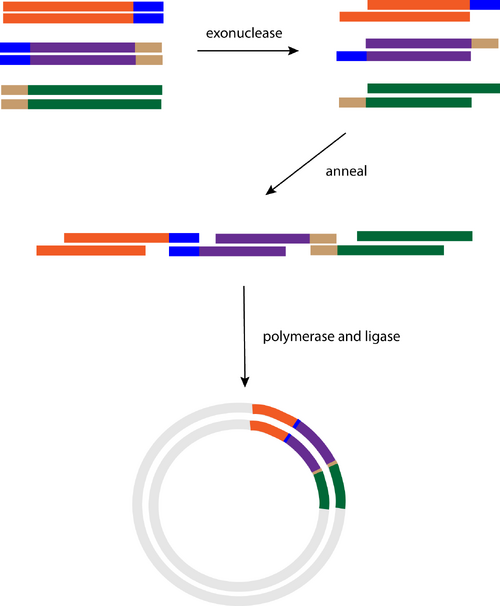 In 2009, Daniel Gibson of J. Craig Venter's group reported a method for assembling hundreds of kilobases of DNA sequence using an isothermal enzymatic setup known today as "Gibson Assembly" [29][4][30][31]. Sub-fragments of the eventual assembly product are obtained as blunt-ended double-stranded DNA molecules several kilobases in length. They share several hundred bases of homology at their adjacent termini. T5 DNA Exonuclease chews back the double-stranded DNA molecule to reveal 3' single-stranded overhangs. Being heat-liable, T5 exonuclease is inactivated after several minutes at the reaction temperature. A mixture of thermostable ligase (Taq) and DNA polymerase (commonly Phusion) repair and assemble the individual fragments into larger molecules. This method has been used to assemble nonfunctional DNA molecules up to 900 kilobases in length, as well as the complete 16.3 kilobase mouse mitochondrial genome [32]. The size limit of molecules that can be assembled in this manner is currently limited to the cost of design and screening the final assembly products and the hundreds of kilobases of DNA that must be sequenced. An illustrative video of this process can be found on the NEB website. Of all the cloning techniques listed on this page, "Gibson" cloning is becoming one of the most dominant cloning strategies in synthetic biology labs. Its fast, flexible, relatively simple design has made it a favorite among synthetic biologists.