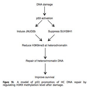 After DNA is replicated biochemical marks need to be made and recognized for HC packaging. Hypoacetylation and methylation are used to characterize HC and initiate the transition between euchromatin and HC [4]. Histone H3 methylated at lysine 9 trimethylation (H3K9me3) represses transcription and silences genes after DNA damage. In mouse cells, the histone methyltransferase SUV39H1/2 regulates H3K9me3 and telomere modification to protect HC and DSB repair. However, the Jumonji domain 2 family demethylase (JMJD2b) reverses methylation done by H3K9me3 and negates the effectiveness of SUV39H1. Therefore, overexpression of JMJD2b has been linked to cancer development and chromosome instability. This research investigates how p53 affects the events of DNA damage repair via regulation of JMJD2b and SUV39H1 levels [1].