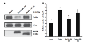 Immunodection experiments were performed to determine if parkin associates with proteins recruited for NER. PCNA is a protein needed for NER that is activated by ubiquitination. Immunoblotting, co-immunoprecipitation, and reverse co-immunoprecipatation identified a definite interaction between the two proteins Fig 3A. More specifically, PCNA was demonstrated to interact with the first ring finger region of parkin (R1-IBR) through its PIP binding domain Fig 3B-C. When the parkin/PCNA interaction was inhibited by the R1-IBR/PCNA interaction there was a reduction in repair activity Fig 4B [1].