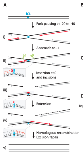 Fanconi Anemia is a genetic disorder resulting from the mutation of one of at least 15 gene products involved in DNA repair. Eight of these proteins, FANC(A, B, C, E, F, G, L, M) bind to form the FA core complex, which can ubiquitylate FANCD2 and FANCI in response to Interstrand Crosslinks (ICLs). (2) Like most DNA Damage, these crosslinks can arise from a variety of endogenous and exogenous sources, but the most common insults come from anti-cancer agents such as cisplatin and intercalating agents such as psoralen. It has been estimated that a repair-proficient bacterium can withstand about 20 cross-links through base-excision repair, in which the cross-linked bases are removed and replaced. (3) However, mammalian cells must be able to withstand much more damage, and it was estimated in the same study that most could repair several hundreds of cross-links. FANCI-FANCD2 is important for the repair of these cross-links, specifically in S phase of the cell cycle, but the mechanism by which this complex acts is not clear. The resolution of the ICL proceeds with the stalling of two replication forks in the -20 to -40 base pairs from the damage, a leading strand approach to the -1 position, a cut of the lagging strand DNA from both sides, and extension of the crosslinked DNA strand, which can lead to homologous recombination to fix the cut DNA. (Figure 1A) Here, the authors showed that FANCD2 is ubiquitylated on Lysine 562 upon encountering an X-structure of crosslinked DNA and complexes with FANCI to promote DNA cuts surrounding the crosslink in order for repair to continue.