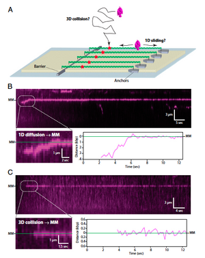 To examine the mobility of the MutSa/MutLa early mismatch repair recognition system on DNA, the authors used Total Internal Reflection Fluorescence Microscopy to examine single-molecule curtains of DNA aligned in flowcells. A small volume flowcell was constructed on the surface of a quartz slide, and then a lipid membrane was coated to the inside, allowing lambda DNA(containing a short region with three mismatches to flow until it reached nanofabricated chrome barriers. The chrome barriers prevented further flow of the DNA ends, allowing them to be stretched out and visualized. Quantum dot conjugated MutSa was then applied to the flowcell, and observed binding to the DNA. The authors noted that MutSa bound somewhat specifically to mismatches, so they designed further experiments. (Figure 1) Using a dig-tag on nanofabricated islands, the authors were able to double-tether the DNA and observe the mobility of MutSa in the absence of flow. They found that MutSa could find the mismatch by either 1D sliding (first binding to the DNA and then sliding to the mismatch), or by 3D diffusion (binding directly to the mismatch). (Figure 2)