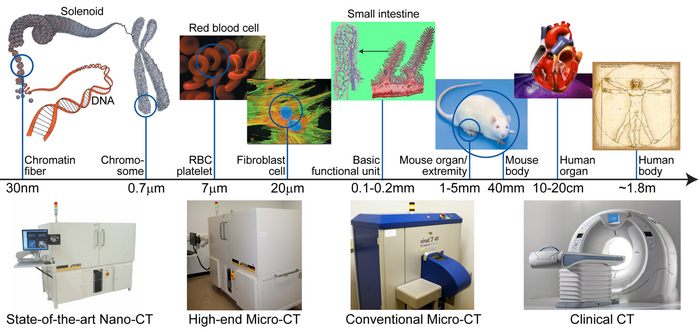 As seen above in Figure 4, a range of CT images can be created on a large range of scales. The most common and most widely used being the commercial CT machine used in hospitals. Micro CT scanners are more often used for research, seen in the next section, and are able to capture images in the micro scale with excellent detail. Lastly, nano-CT scanners are rare with only a few available currently, with the ability to image cellular components and are exclusively used for research.