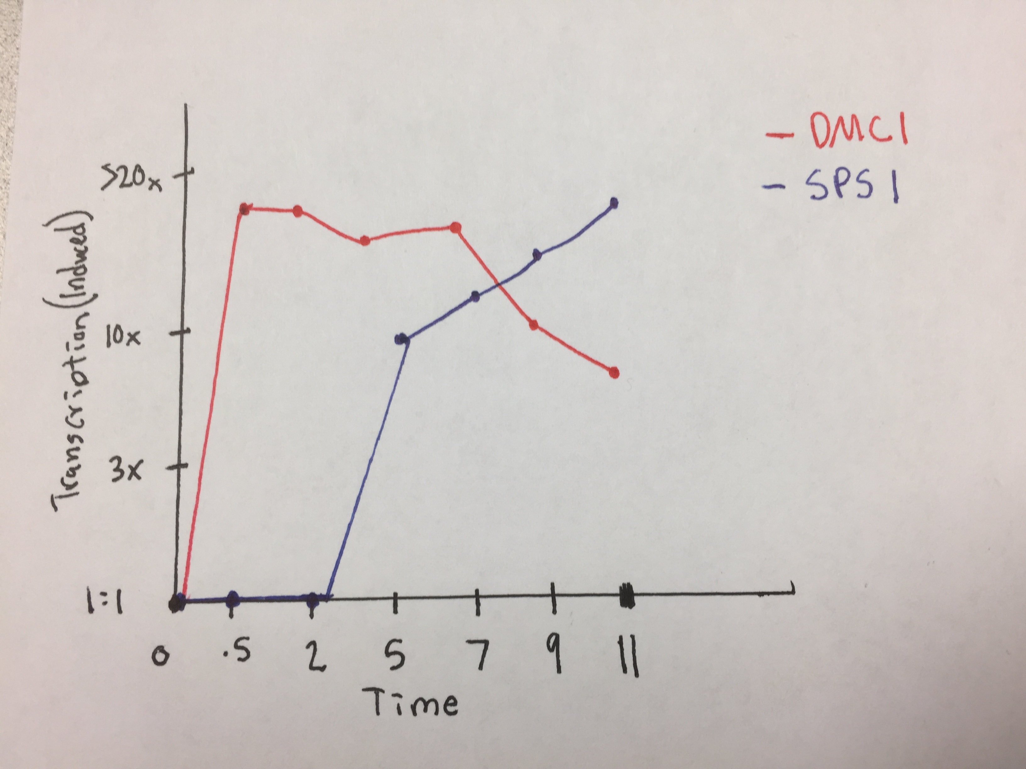 (Question 5, p. 110) Choose two genes from Figure 4.6b (PDF of figures on Brightspace) and draw a graph to represent the change in transcription over time. You can either create your plot in Excel and put the image up on your wiki page or you can do it by hand and upload a picture or scan.