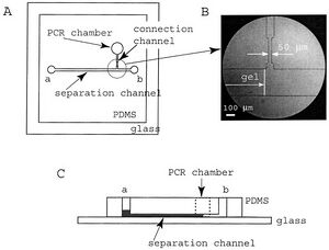 The biotechnology industry uses CGE method for separation analysis of biomaterials on a routine basis with microchips. As other processes must be run prior to CGE for protein and nucleic acid analysis, microchips provide the opportunity to run these assays concomitantly on the same platform. This allows the cost of the experiment to be low during the analytical trials. In addition, CGE provides an alternative to liquid chromatography with higher resolution quality and ability to be incorporated into a microchip. Figure 4 shows a classic PDMS microchip that incorporates two parts: a PCR chamber to amplify the DNA, and a separation chamber to separate the DNA strands.
