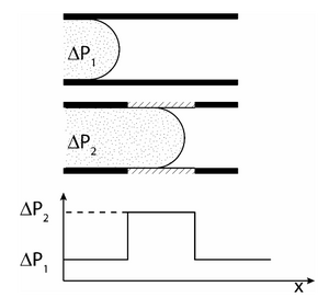 A local change in geometry can change the contact angle of the liquid as in Figures 3,4, which will change the pressure needed to push the liquid along. The barrier needed to push the liquid across this change in contact angle is called the burst pressure. This is usually a less effective method for capillary valves so it is combined with the other method of adding a hydrophobic surface.5