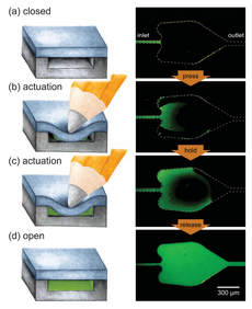 Capillary stop valves are used to stop flow in a channel using a sudden divergence of the channel cross-section. This divergence usually means a constriction in the channel followed by sudden enlargement (See Figure 5). This change in geometry results in a change in the contact angle between the liquid and the solid interface, stopping the wicking of the fluid. The pressure difference required for the fluid to resume flow can be calculated in terms of the channel geometry and contact angle of the liquid at the point of divergence (See: capillary pressure). To restart capillary flow an external pneumatic or centrifugal force must be applied. The geometry of the valve can also be reverted using soft capillary valves. This process is important for biological process that cannot be interfered with by hydrophobic interfaces.4 Biological applications that involve proteins will suffer from hydrophobic collapse, strong hydrophobic interactions between the protein and the superhydrophobic surface. Capillary soft valves use the idea of the local change in geometry to prevent flow and are activated by simply compressing the valve to change the shape. This causes the liquid to fill the valve and flow is continuous. The flow cannot be stopped once the valve is compressed and liquid flows through.6