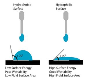 An interface is a clearly defined region between two distinct phases. In the case of microfluidics, it usually represents the solid channel and liquid species boundary. Molecules of the liquid will experience an attractive force coming from other molecules of the liquid (polar interactions, van der Waals forces) and an attractive force coming from the solid channel. These forces will differ in magnitude, creating what is known as surface tension.11 Surface energy, also known as interfacial free energy, is a measure of the forces at the interface of two components. Surface energy can also be defined as the work required to increase the unit surface area at constant temperature and pressure. As seen in Figure 1, when a liquid drop is added to a hydrophobic material it will bead up to minimize its surface area, minimizing surface energy.11 When a liquid drop is added to a hydrophilic material, it will increase its surface area to minimize surface energy.