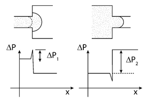 When there is capillary flow through a microchannel, surface energy is minimized. There is high solid surface energy and low liquid surface energy, resulting in wicking of fluid. In this instance, the surface energy is minimized when the liquid increases its surface area. It is this minimization of free energy that allows the liquid to move passively along the channel. When the liquid reaches an abrupt change in geometry or hydrophobicity, the contact angle of the liquid and solid interface is changed. Using this concept allows for the construction of capillary valves that can be configured to obtain a variety of different valving conditions. The ability of the valve to stop the liquid can be determined using the Young-Laplace equation (See: design theory). By designing a capillary valve properly, the pressure required to burst it can be determined mathematically.