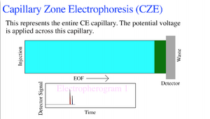 The basic principle of electrophoresis is the movement of charged particles as the result of an electric gradient. Capillary electrophoresis frequently substitutes the gel that is typical of an electrophoresis medium, with a capillary. These tubes typically have dimensions of roughly 50 μm by 100cm in length, and are operated from 20-30kV[1]. These high voltages enable a fast separation, and well-defined “zones” of analyte. Each end of the capillary tube is dipped into a buffer solution and one end is put in the inlet solution with the anode and the other with the end runs through the detector and to the cathode vial. The analytes will migrate through the capillary due to the electric gradient and will separate into bands from each other based on size. In zone electrophoresis these zones are well defined with areas of buffer separating zones. As the zones pass the detector they are typically detected with UV absorption near the 200nm range. Because of the high voltage, and thus tighter bands, the resultant electropherogram will display narrow peaks that correspond to the respective analyte. Unlike in capillary isotachophoresis the capillary zone electrophoresis should separate into bands with buffer between bands [2]. These buffer bands mean that the electropherogram should return to 0 between analyte detections.