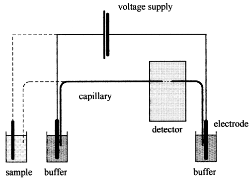 Capillary Electrophoresis (CE) is a separation technique performed on the micro or nanoscale. [1] This technique analyzes analytes utilizing the movement of charged particles in an electric field through a fluid or gel. [3] This difference in the charge to mass ratio is what makes this technique different from other high throuhput techniques such as High Performance Liquid Chromatography (HPLC). The primary methods used in CE are capillary zone electrophoresis (CZE), micellar electrokinetic chromatography (MEKC or MECC), capillary electrochromatography (CEC), capillary isoelectric focusing (CIEF), capillary gel electrophoresis (CGE) and capillary isotachophoresis (CITP). [1] The instrumentation used for CE has a general setup of an injection system, a capillary tube for separation, and a high voltage supply. There are two methods for injecting samples are hydrodynamic and electrokinetic mode. Hydrodynamic injection uses pressure or vacuum application to carry the sample to the sample solution to the capillary tube and is nonselective. Described by Poiseulle's Law