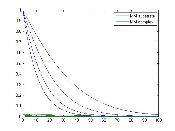 - Set k1 = 2.0, k-1 = 0.0. Plot the substrate dynamics for k2 = 1.0, k2 = 2.0, k2 = 5.0, k2 = 10.0 all on the same graph to see the effect of this parameter.