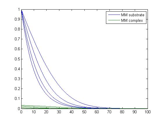 - Set k1 = 2.0, k-1 = 1.0. Plot the substrate dynamics for k2 = 1.0, k2 = 2.0, k2 = 5.0, k2 = 10.0 all on the same graph to see the effect of this parameter.