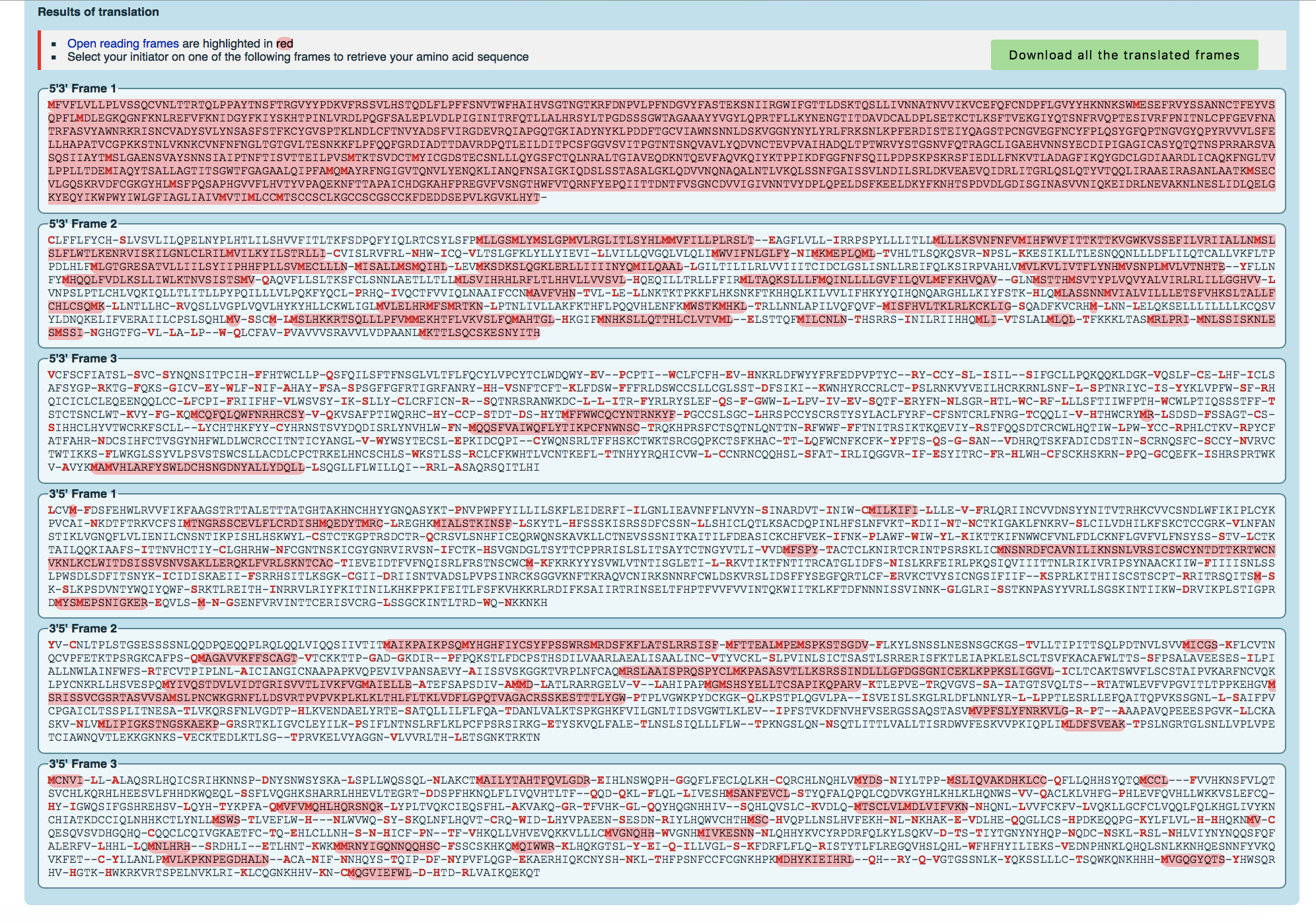 - How do you know which of the six frames is the correct reading frame (without looking up the answer)? Of the six frames, the correct reading frame is the one with the most part highlighted red so the first frame.