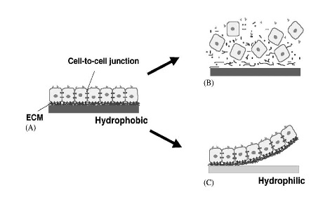 It is likely that many tissue engineers hypothesized the idea of harvesting a sheet of cells as one, well before it was first accomplished. The actual success of producing a cell sheet did not, however, become a reality until the discovery of thermo-responsive polymer surface technology in 1990 [1]. This discovery was motivated by the biggest flaw of cell injection therapy, the use of trypsin to separate cells from polymeric culture surfaces. While trypsin, a hydrolyzing protease, is effective in breaking down cell-surface adhesions, it also breaks down cell-cell adhesions and hydrolyzes cell membrane proteins, decreasing cell functionality [1]. Thermo-responsive polymer surface technology allows for the detachment of cells from their polymer surface without compromising cell function. This is possible because the polymer itself experiences a change in its attraction to water molecules as temperature changes over a certain range. Poly(N-isopropylacrylamide) (PIPAAm) is the most notable polymer utilized for this type of cell harvesting. At a temperature of 37°C, PIPAAm is hydrophobic, leaving its binding sites open for cell adhesion. A drop of only 5°C results in hydrophilic polymer behavior, pulling in water molecules which compete with the cells for binding [3]. This hydrophilicity is very strong, causing PIPAAm to absorb water and swell, releasing its bound cells. Alongside the experiments that proved this, it was noted that cells harvested from PIPAAm maintained cell to cell adhesions [1]. This is contrary to the case of trypsin digestion, as all adhesion proteins are broken down by the protease. The differences between the two cell harvesting techniques are illustrated in Figure 1.