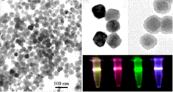 Both down-conversion and up-conversion fluorescent inorganic nanoparticles (quantum dots, lanthanide doped nanocrystals) are synthesized and used as fluorescent labels or imaging probes for biodetection & bioimaging. The up-conversion fluorescent nanoparticles can convert near infrared (NIR) light to visible light. Compared to conventional down-conversion fluorescent materials such as organic dyes and quantum dots, these nanoparticles have the following advantages: High light penetration depth in tissues; No photodamage to living organisms; Weak autofluorescence from cells or tissues; Low background light and high sensitivity for detection. Li ZQ & Zhang Y, Angewandte Chemie International Edition 2006, 45, 7732-7735.