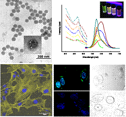 Multi-color fluorescent quantum dots and magnetic agents are encapsulated within nanometer-sized (~50 nm) chitosan nanoparticles. The small size of the nanoparticles allows them to be used as a labeling tag, at the same time, as a contrast agent in magnetic resonance imaging (MRI) as well. In the labeling of cancer cells, specific targeting molecules that recognize cancer cells can be attached to the surface of the nanoparticles so that they bind onto the surface of the cancer cells specifically. This can potentially help in the localization and identification of a cancerous tissue. Moreover, these nanoparticles can be used to deliver therapeutic drugs, proteins and genes by intravenous, oral and mucosal administration. Using these nanoparticles, drugs or genes can be precisely delivered to the specific cells or specific regions of tissues with aid of imaging techniques, for various applications. Tan WB & Zhang Y, Advanced Materials 2005, 17, 2375-2380. Tan WB, Jiang S & Zhang Y. Biomaterials, in press