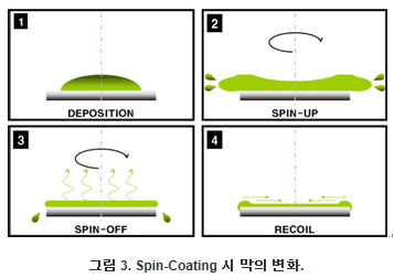 - -현재의 스핀리스(Spinless)라고 불리는 Slit-only (정확하게는 Extrusion 또는 Slot 방식이라 해야 옳다) 방식이 자리잡기 전에는 균일한 박막 형성을 위해 스핀 코팅(Spin-coating) 기술이 일반적이었다. 스핀 코팅은 점도가 있는 용액을 적당량 기판에 도포한 후 기판을 회전시켜 일정한 두께의 박막을 형성하는 기술이다. 박막의 두께는 용액의 점도와 스핀 속도 및 시간에 의해 결정된다.